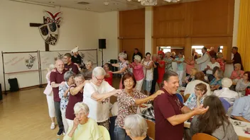 Beste Stimmung beim Seniorenfest: Präsident Gustav Rautenbach führte die Polonaise an – begleitet von kölschen Liedern der Rotznas.“